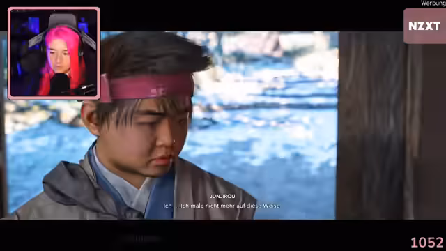 00:48:23Nach einem Zeitsprung zwei Jahre in die Vergangenheit übernimmt der Spieler die Rolle der jugendlichen Protagonistin. Sie wird von ihrem Vater hart trainiert und erlebt eine strenge, aber doch liebevolle Erziehung im Ninja-Clan Iga. Die Streamerin ist von der detailreichen Welt und der Atmosphäre tief beeindruckt und zeigt Sympathie für die Charaktere.