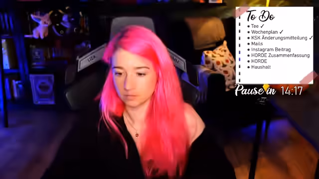 00:08:55Der Stream beginnt mit der Einführung einer neuen Tradition: dem Montags-Coworking. Die Initiative entstand aus dem Wunsch heraus, produktiv in die Woche zu starten, da die bisherigen Coworking-Tage dienstags und donnerstags nicht mehr optimal in den Zeitplan passten. Das Montags-Coworking soll dazu dienen, sich für die kommende Woche vorzubereiten und motiviert zu starten. Es wird betont, dass dieser Tag genutzt werden soll, um „Kackaufgaben“ wie Haushalts- und Buchhaltungsarbeiten sowie das Erstellen von To-Do-Listen gemeinsam zu erledigen. Die Atmosphäre ist von gegenseitiger Motivation geprägt, und es wird vorgeschlagen, eine Haushalts-Pomodoro einzulegen, um beispielsweise die Wäsche zu erledigen. Die Streamerin teilt mit, dass sie selbst noch ihren Wochenplan erstellen und eine seit Jahren aufgeschobene E-Mail abschicken muss. Die erste Coworking-Session startet nach einer kurzen Tee-Pause, um direkt in die produktive Phase überzugehen.