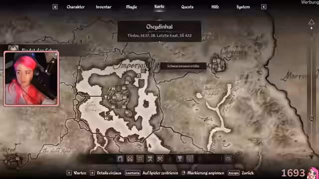 04:24:01Die Streamerin erkundet eine Stadt und sucht nach verschiedenen Gilden, darunter der Diebesgilde, um gestohlene Waren zu verkaufen. Nachdem sie die Diebesgilde nicht findet, konzentriert sie sich auf die Suche nach einer bestimmten Person, Raynaud Germain, in der Stadt. Dabei verfehlt sie den Charakter und erkennt, dass sie möglicherweise die falsche Quest zuerst bearbeitet hat.
