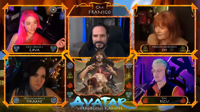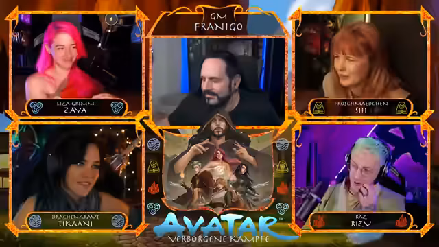 05:38:39Nach der Pause begrüßt die Streamerin die Zuschauer zur neuen Folge des Avatar Pen & Paper. Sie stellt die Mitspieler vor: Drachenkraut als Wasserbändigerin, Froschmädchen, Raz als Luftbändigerin und sich selbst als Luftbändigerin Zaya. Sie erinnert an die bisherige Handlung, in der die Gruppe die dunkle Pagode aufhalten soll.