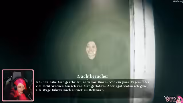 03:16:54Ein unerwarteter Anruf durchbricht die Stille. Eine fremde Stimme warnt den Streamer, dem Menschen und dem Pager nicht zu vertrauen, und beschreibt den Laden als unentrinnbares Labyrinth ohne echten Ausgang. Sie deutet an, dass das gesamte Einkaufszentrum irre und verdächtig ist, und verspricht, ein wichtiges Geheimnis zu verraten, wenn der Streamer sie reinlässt. Der Anruf endet abrupt und hinterlässt den Streamer verwirrt und verstört.