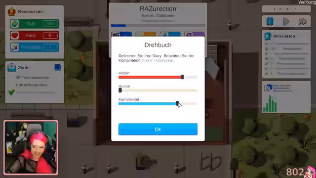 00:59:33Als nächstes wird das Spiel 'Absolute Cinema' getestet, in dem man ein Filmimperium aufbaut. Die Streamerin erstellt ihren eigenen Charakter 'Lise Grümel' und beginnt, ihren ersten Film 'Das Leben des Raz' zu drehen. Dabei wählt sie das Genre Melodrama und castet Schauspieler. Während des Spiels werden Aspekte wie Budget, Kritikerwertungen und Publikumsreaktionen simuliert. Die Streamerin testet verschiedene Mechaniken und interagiert mit dem Chat über die Entwicklung ihres Filmprojekts und die Bewertung des ersten Films.