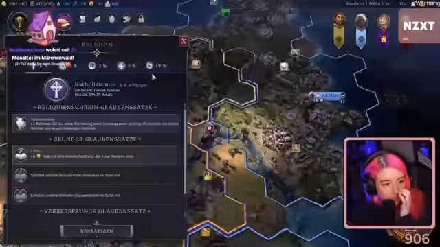 01:07:55Im Spiel gründet der Streamer die eigene Religion 'Flutschiger Koi', um kulturell Einfluss zu nehmen. Missionare werden ausgeschickt, um andere Zivilisationen, insbesondere Stadtstaaten und Sparta, zu bekehren. Gleichzeitig wird technologisch in Forschungsbereiche wie Theologie und Burgen investiert, um die Expansion und Verteidigung der Zivilisation zu stärken.