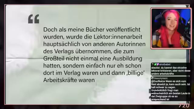 02:26:32Die Streamerin kündigte ihr Arbeitsverhältnis beim Vajona Verlag Anfang 2025, nachdem sie dort über ein duales Studium gearbeitet hatte. Der Post dazu erhielt fast 100.000 Aufrufe, allerdings wurden die genauen Gründe für die Trennung nicht genannt. Der Streamer berichtet, dass die Buchbranche generell als sehr ausbeuterisch gilt, mit häufiger Unterbezahlung und Überstunden. Viele junge Menschen verlassen die Branche aus Enttäuschung, da ihre Leidenschaft für das Lesen nicht den Erwartungen an den Beruf entspricht. Die Kündigung der Streamerin ist im Kontext dieser branchenweiten Probleme zu sehen, die oft zu hohem Druck und emotionalem Stress führen.