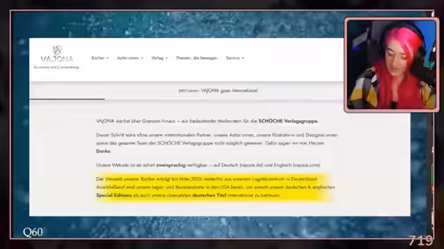 02:17:23Der Stream bespricht verschiedene Verlagshäuser wie Fester Verlag und Vajona Verlag, die sich auf spezifische Genres wie Horror und Belletristik spezialisiert haben. Besonders hervorgehoben wird die Gründung der Schöchel Verlagsgruppe durch Vanessa Lipinski (früher Schöche), die neben dem Vajona Verlag auch den Schwesterverlag Vajos umfasst. Die Gruppe plant bis Mitte 2026 den Versand aus Deutschland und anschließend den Betrieb von Lager- und Bürostandorten in den USA, um sowohl deutsche als auch englische Titel international zu vertreten. Diese internationale Expansion ist bemerkenswert, da Verlage normalerweise über Agenturen internationale Rechte vergeben, während Vajona dies selbst übernehmen möchte.