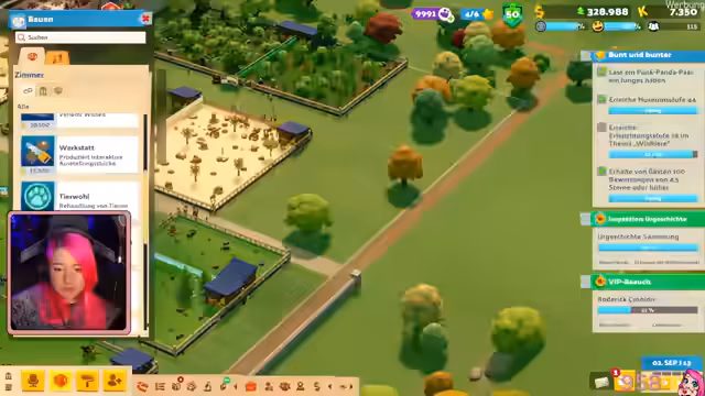02:41:15Führung durch das virtuelle Museum mit Ziel Erleuchtungsstufe 18 bei Wildtieren. Vorgestellt werden Regenbogenhamster, Ochsenfrösche, Zickzack-Zebras (als Nixenlöwen bezeichnet), Schildkröten, Happy Baras und Borkenferkel. Sie erklärt die Mitarbeiterbereiche und Terrarien. Besonders betont wird die Twitch-Integration, die es dem Chat erlaubt, aktiv mitzuspielen und Einfluss auf das Museumsgeschehen zu nehmen.