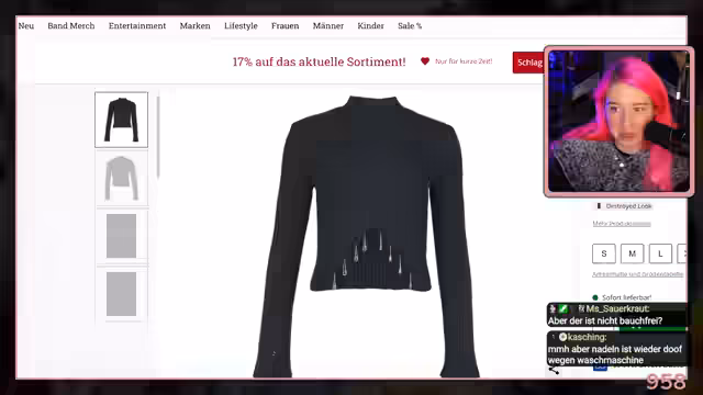 02:26:56Der Streamer stellt den neuen EMP Ambassador-Status vor und teilt einen exklusiven Rabattcode (25% mit Code Liza), der für die Zuschauer gilt. Es folgt ein Durchstöbern der neuen Bekleidungsartikel, wobei Mode wie ein Kimono-Blazer, ein Beetlejuice-Rock und ein Kleid mit Schnürungen bewertet werden. Der Streamer zeigt Interesse an bestimmten Stücken, diskutiert Passform und persönlichen Stil, und wählt schließlich mehrere Artikel für den eigenen Warenkorb aus, einschließlich Strumpfhosen. Es wird betont, dass der Rabatt großzügig ist (von 20% auf 25% erhöht) und sich lohnt. Der Shop-Vorgang wird als unterhaltsames und anregendes Segment dargestellt, bei dem der Streamer seinen Stil mit gothic- und kreativ inspirierten Teilen zusammenstellt.