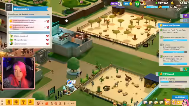 02:47:32Systematische Arbeit am Museum: Expeditionen zur Entdeckung neuer Tiere, Einstellung von Wildtierexperten und strategische Auswilderung. Die Streamerin erklärt, dass durchschnittliche Tiere ausgewildert werden, um Platz für makellose/exzellente Tiere zu schaffen. Ein Beispiel sind drei männliche und ein weibliches Zickzack-Zebras, wobei nur die Beste bleibt. Mitarbeiter werden für spezifische Aufgaben wie Forschung und Pflege eingestellt.