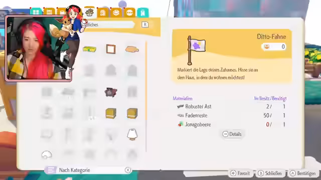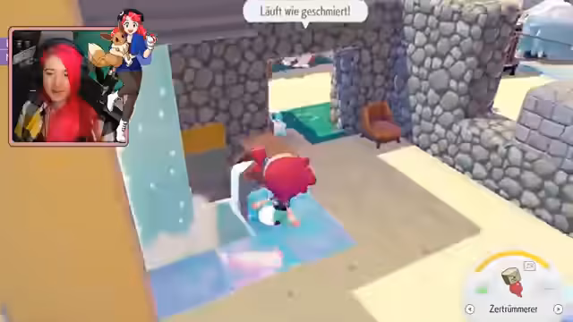 01:25:31Nachdem sie das fehlende Habitat für Ditto bemerkt hat, beginnt Liza, nach Baumaterialien zu suchen. Auf einer Wunderinsel sammelt sie Kupfer, Kalkstein und andere Ressourcen. Der Chat gibt ihr den Tipp, dass bestimmte Puckepuppen zu Inseln führen können, wo sie viele Steine findet. Nachdem sie die Materialien gesammelt hat, beginnt sie damit, ein neues Haus für ein Pokémon abzureissen, um es später wieder aufzubauen und dadurch das Umgebungslevel zu erhöhen.