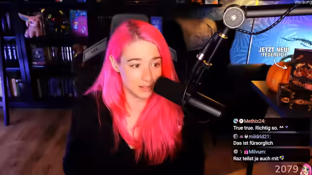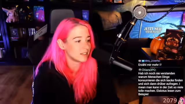 01:57:52Die Streamerin macht Werbung für ihr neues Buch, indem sie es in die Kamera hält und die Zuhörer zum Kauf auffordert. Sie liest den Klappentext vor, der eine Mischung aus 'Avatar' und 'Die Tribute von Panem' verspricht. Zudem kündigt sie eine Lesereise im Herbst an, mit Terminen in Paderborn, Gräfen, Dillingen (an der Saar) und Ilmenau. Alternativ bietet sie monatliche Online-Lesungen auf Patreon an. Es wird kurz auf die Schwierigkeit von Fantasy-Übersetzungen ins Englische eingegangen und die Möglichkeit diskutiert, signierte Exemplare über den Cronk Shop zu verkaufen. Die Streamerin erzählt von einer kuriosen Situation auf der Polaris Convention, wo sie von der Security gebeten wurde, den öffentlichen Raum zu verlassen, da sich eine zu große Schlange gebildet hatte. Sie betont, dass man sie ansprechen kann, es sei denn, sie isst, da sie in diesem Zustand sehr ungerne gestört wird. Abschließend wird auf die Frage eingegangen, ob sie ein Autoritätsproblem hat, was sie bejaht und auf ihre Erfahrungen in der Freiwilligen Feuerwehr eingeht.