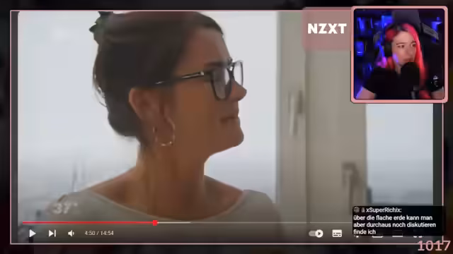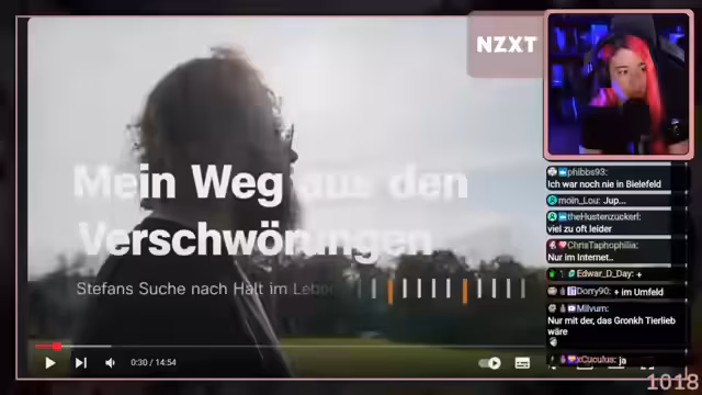 02:53:24Die Streamerin leitet einen Abschnitt über Verschwörungserzählungen ein und zeigt einen Dokumentarfilm. Die Dokumentation erzählt die Geschichte von Stefan, der im Alter von 14 Jahren nach dem Tod seiner Mutter in die Welt der Chemtrail-Verschwörungstheorien abdriftete. Diese Theorien gaben ihm ein Gefühl von Überlegenheit und Kontrolle, beschäftigten ihn aber auch jahrelang.