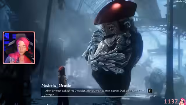 04:15:19Die Gruppe stößt auf eine neue NPCs, die sich als Modeschöpfin und ehemalige Groß-Debattiererin vorstellt. Sie fordert die Streamerin zu einem 'Duell der schönen Worte' auf, bei dem poetische Sätze vervollständigt werden müssen. Dieses Ereignis beleuchtet die reiche Lore der Grandis-Kultur und ihre Traditionen, die nicht durch Gewalt, sondern durch die Schärfe des Verstandes ausgetragen wurden. Der kreative und humorvolle Dialog bietet eine willkommene Abwechslung vom actionreichen Kampf.