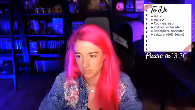 00:11:04Der Stream beginnt mit einer lockeren Begrüßung an die Zuschauer, nachdem technische Anfangsprobleme behoben wurden. Die Streamerin teilt mit, dass sie aufgrund von nächtlichem Hundekot und resultingierender Schlafprobleme, sowie eigenen Rückenschmerzen, den Stream früher beenden muss. Der Alltag wird als belastend beschrieben, mit einer langen To-Do-Liste, die E-Mails, Rechnungen, Podcast-Vorbereitungen und ein intensives Lektorat umfasst.