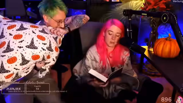 04:16:34Während einer Lesung werden spendenbasierte Challenges umgesetzt: Für 5 Euro tätschelt der Gast die Moderatorin, für 10 Euro erhält sie einen Kissenbonk (mit klaren Regeln zur Ausführung), und für 50 Euro tauschen beide die Rollen. Die Lesung wird immer wieder unterbrochen, um die Challenges auszuführen, während der Text aus einem Fantasy-Buch ('Nara' und 'Kori') weitergelesen wird.
