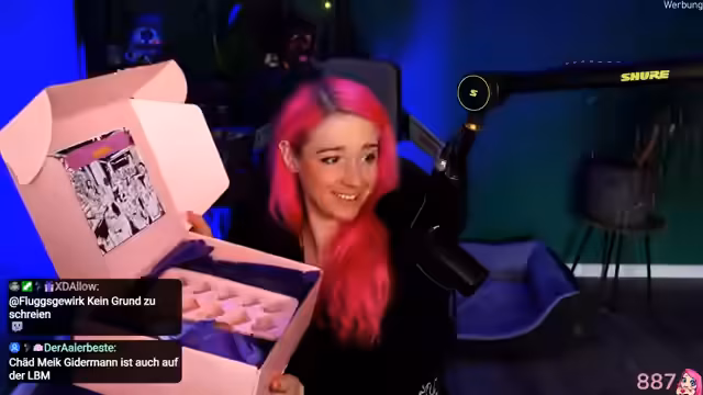 00:24:41Die Streamerin präsentiert eine von ihrem Freund Mike geschickte Box, die ein signiertes Exemplar seines neuen Buches 'I'm here to help' enthält. Sie ist sichtlich begeistert und zeigt eine Illustration aus der Danksagung, auf der sie selbst abgebildet ist. Das Buch, ein Gespräch über Männer mit dem schwulen besten Freund, beschreibt sie als sehr angenehm zu lesen und humorvoll aufklärend. Sie kündigt an, das Buch bis zur Leipziger Buchmesse gelesen zu haben, wo Mike ebenfalls erscheint. Zudem erwähnt sie eine Release-Party und nervt sich leicht vor einer bevorstehenden Lesung in Nürnberg, da erstmals Teile ihrer Familie anwesend sein werden.