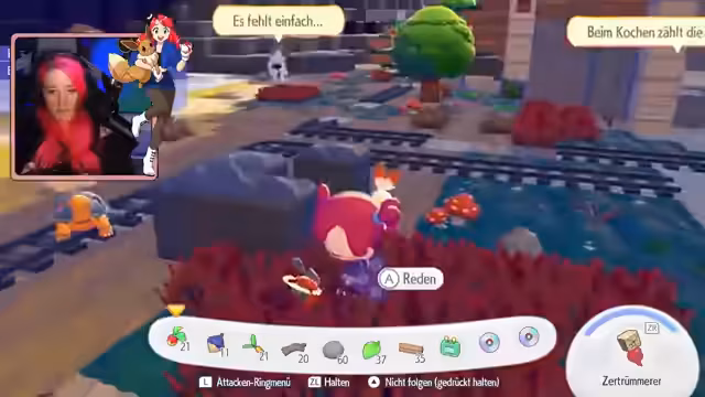 00:29:51Nach persönlichen Gesprächen wechselt die Streamerin zum Spiel Porcopia. Das Ziel für den Stream ist es, eine Evolution für Evoli, speziell das Pokémon Flamara, zu finden. Zuvor müssen sie jedoch eine Hauptquest erfüllen, die den Bau eines Brotbackofes erfordert. Nach einigen Schwierigkeiten beim Finden des Rezepts und der notwendigen Materialien, wie Quirtel, gelingt es ihr, den Backofen herzustellen. Sie baut ihn in ihre Basis ein und beginnt, Brot zu backen, was den nächsten Teil der Quest erfüllt.