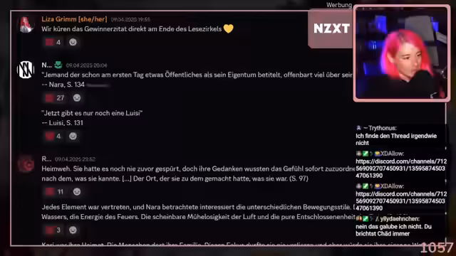 02:08:58Der Fokus des Streams verlagert sich auf die gemeinsame Leseaktion des Buches "Eislotus". Bisher wurden bis Seite 182 gelesen. Ein fester Bestandteil ist die wöchentliche Wahl eines Lieblingszitates, das anschließend von einem Illustrator in ein Banner für Discord umgewandelt wird. Die Community ist aktiv an der Abstimmung beteiligt und interagiert intensiv mit den Inhalten des Buches.
