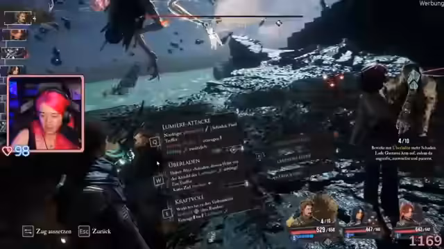 01:36:28Die Streamerin spielt verschiedene Spiele und diskutiert deren Vor- und Nachteile. Im Mittelpunkt steht ihr Kampf in einem Spiel namens 'Claire Obscure', wo sie gegen einen Boss kämpft. Sie beschreibt ihre Strategie, die Herausforderungen und ihre Reaktionen auf die Situation. Der Kampf erfordert viele Versuche und viel Konzentration. Die Streamerin zeigt sich frustriert, aber motiviert weiterzumachen, während sie Zuschauereingaben berücksichtigt.