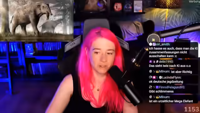 00:45:16Die Streamerin entdeckt prähistorische Tiere und teilt ihre Faszination für Dinosaurier und ausgestorbene Arten mit. Sie zeigt Bilder von Urelefanten und anderen Tieren wie dem Platybelodon, das wie aus einem Albtraum aussieht. Sie überlegt, ein Quiz zu machen, bei dem sie Bilder von Tieren-Vorfahren zeigt und die Zuschauer raten müssen, was daraus geworden ist. Auch ihr bevorstehender Besuch in einer Dino-Ausstellung wird erwähnt.