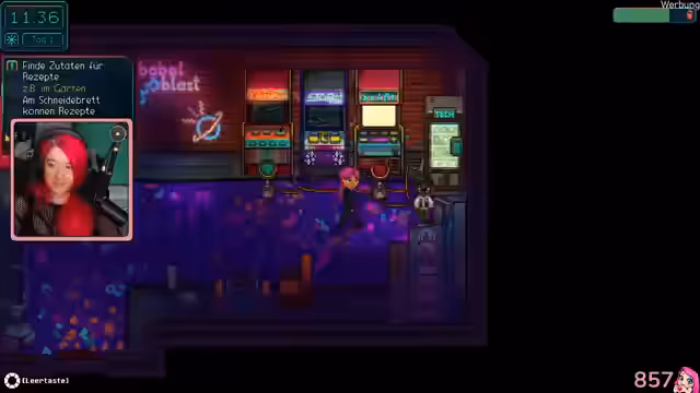 00:44:31Im Laufe des Spiels wird die Buchhandlung weiter ausgebaut und mit mehr Regalen, Möbeln und Dekoration wie einem großen Buch oder einem Lesesessel ausgestattet. Es werden Minispiele zum Sortieren von Büchern gelöst und die Aufräumaktion am Strand angestoßen. Der Stream interagiert mit den Bewohnern von Novelhaven, die譬如 Rollschuh-Disco veranstalten wollen. Die Streamerin stellt fest, dass das Spiel Spaß macht, aber auch frustrierend sein kann, wenn Gegenstände nicht wie gewünscht platziert werden können.