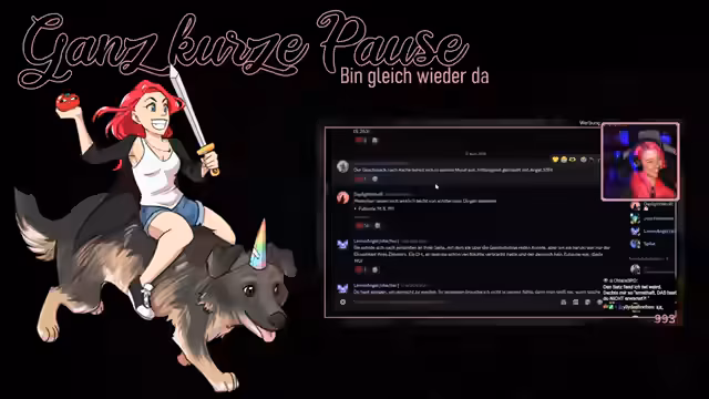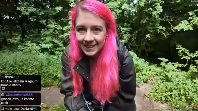 01:33:33Während eines Spaziergangs zu einer Burg wird ein Abenteuerweg erkundet. Der Weg wird als anspruchsvoll und für den alten Hund Django ungeeignet beschrieben, weshalb er auf einer Seite des Weges zurückgelassen werden muss. Dies führt zu einer komischen Situation, in der die Streamerin den Chat virtuell über einen Hindernisparcours führen muss. Der Stream wird aufgrund fehlenden Empfangs für kurze Zeit unterbrochen, was ein gemeinsames Erkunden des Waldes beendet.