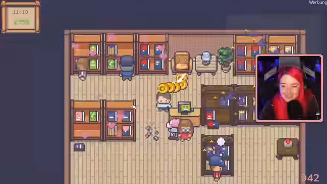 03:07:55Es beginnt der traditionelle Demo-Sunday mit einem neuen Spiel. Die Streamerin übernimmt die Rolle einer Buchladenbesitzerin in einem Pixel-artigen Spiel. Sie kauft Bücher, richtet Regale ein und versucht, Kunden zu bedienen. Dabei treten Steuerungsprobleme auf, was den chaotischen Charme des Spiels verstärkt. Die Streamerin ist von der cozy Atmosphäre und dem Potenzial überzeugt und möchte es auf die Wunschliste setzen.