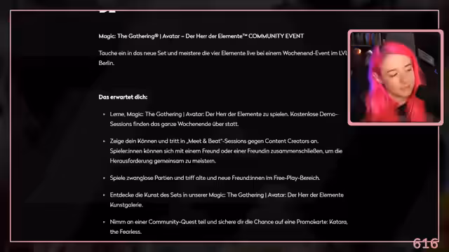 00:17:54Es wird ein besonderes Event in Berlin angekündigt: ein Magic: The Gathering-Event zum Avatar: The Last Airbender-Set, das am Wochenende (Samstag und Sonntag) stattfindet. Der Eintritt ist kostenlos, eine Vorab-Registrierung für Tickets wird jedoch empfohlen, um den Einlass zu sichern. Das Highlight des Events ist eine exklusive Promokarte, die an die ersten 250 Teilnehmer pro Tag ausgegeben wird. Es wird betont, dass es sich lohnt, frühzeitig vor Ort zu sein, um diese begehrte Karte zu erhalten. Das Event bietet Demo-Sessions, in denen man Magic the Gathering mit dem neuen Avatar-Set lernen kann, sowie Meet & Beat Sessions, bei denen man gegen Content Creator spielen kann. Eine Kunstgalerie mit Artworks der Magic-Karten und spezielle Cosplay-Fotospots mit Avatar-Cosplayern sind ebenfalls Teil des Programms. Besonders hervorgehoben wird Onkel Iros Teezimmer, in dem Besucher Tee trinken können. Die Streamerin selbst kann aufgrund ihres Geburtstags am Sonntag nicht teilnehmen, äußert aber ihren Neid auf alle, die die Möglichkeit haben, an diesem „sehr coolen Event“ teilzunehmen. Sie bittet die Community, Fotos zu schicken und am Pre-Release-Turnier am Sonntag teilzunehmen, welches jedoch kostenpflichtig ist und eine Anmeldung erfordert. Die Kooperation mit Magic wird als großer Erfolg und Quelle des Stolzes für die Streamerin dargestellt, da sie lange darauf hingearbeitet hat, etwas mit ihnen zum Avatar-Set zu realisieren.
