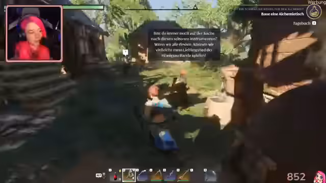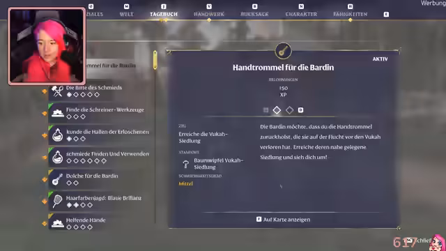 05:21:25Ein Tagebucheintrag über knochige Gesellen und die Kruft wird gefunden, was auf eine neue Quest hindeutet. Die Streamerin geht kurz auf Toilette und bewundert die Einrichtung des Hauses. Es wird über die Drachenhöhle gesprochen, die als nächste Quest ausgewählt wird, obwohl die Streamerin Bedenken wegen der Schwierigkeit hat. Es wird erwähnt, dass Bubsy, eine andere Streamerin, auf dem Weg zum Twitch-Partner ist und unterstützt wird. Die Streamerin fällt ins Wasser und wird nass. Es wird eine Boas in einer Truhe gefunden. Die Streamerin hat Schwierigkeiten, die Drachenhöhle zu erreichen, da der Weg steil und rutschig ist. Es wird über ein Abzeichen für Clips auf Social Media gesprochen, und die Streamerin ermutigt ihre Zuschauer, ihre Clips zu verwenden. Es wird die Drachenhöhle erreicht und das Drachenschwert gefunden, das aufgewertet werden soll. Es wird eine neue Waffe, die Schädelspalteraxt, entdeckt, die mehr Schaden verursacht. Es wird das Düsterdickicht als nächstes Ziel festgelegt. Es wird ein Haus mit viel Lehm entdeckt, das man sich für zukünftige Bauprojekte merken kann. Es wird ein Obelisk und ein schwarzer Kessel gefunden, die auf weitere Quests hindeuten. Die Streamerin plant, eine Warte in der Nähe freizuschalten, um die Reise zu erleichtern. Es wird über die Capybara-Zwischenfälle gesprochen, und die Streamerin bittet darum, das Thema nicht mehr anzusprechen. Es wird die Warte erreicht und aktiviert. Es wird über die Leuchteblumen gesprochen, die man auf dem Weg einsammeln kann. Der Stream wird als lang angekündigt, da die Streamerin die Warte unbedingt abschließen möchte.