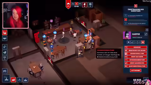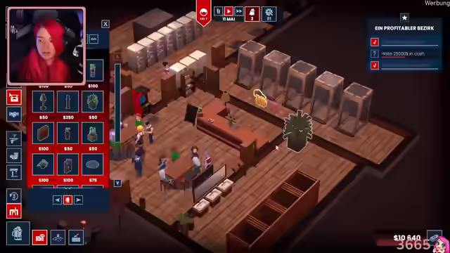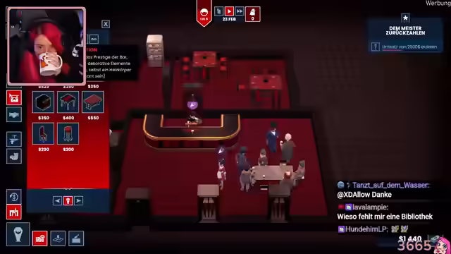 02:23:11Es beginnt eine Gaming-Session mit einem Horror-Game, in dem eine Blutbar eröffnet wird. Es werden erste Schritte im Spiel unternommen, wie das Platzieren von Tischen und Stühlen, das Aufräumen der Bar und das Zuweisen von Aufgaben an Lakaien. Es wird überlegt, wie das Prestige der Bar erhöht werden kann, indem beispielsweise mehr Sitzplätze geschaffen werden. Es wird eine Twitch-Integration im Spiel entdeckt. Es werden Kühlschränke platziert und Blutbeutel gekauft, um den Blutvorrat zu sichern. Es wird überlegt, wie man die Lakaien am besten füttert und wie man Leichen verschwinden lässt. Es wird die Blutsauger-Agentur entdeckt, über die man neue Lakaien rekrutieren kann. Es wird überlegt, wie man die Bar am besten einrichtet und dekoriert, um mehr Kunden anzulocken. Es werden Toiletten und andere Annehmlichkeiten für die Kunden gebaut.