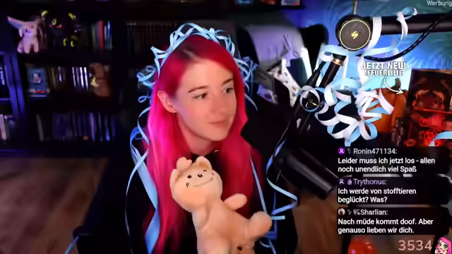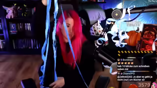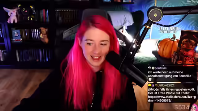 Im Mittelpunkt stand die Vorstellung des neuen Buches 'Feuerlilie', begleitet von Verlosungen von Lillipad-Lampen, Thalia-Gutscheinen und signierten Exemplaren. Die Autorin teilte Anekdoten, sprach über kommende Lesereisen und bedankte sich bei der Twitch- für die Unterstützung. Raz überraschte mit einem Hype Train Kuchen und weiteren Aufmerksamkeiten.