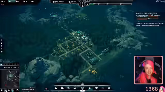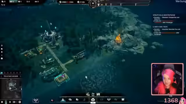 03:04:23Nach dem Bau des Ältesten-Tempels wird festgestellt, dass mehr Glaube benötigt wird, was zu Überlegungen führt, weitere Opfer darzubringen. Der Streamer erwähnt den Namen des Spiels, Cthulhu-irgendwas, und äußert sich enttäuscht darüber, dass noch keine Menschen geopfert werden konnten, obwohl das Spiel erst seit zehn Minuten läuft. Es wird erwartet, dass bald Tentakel erscheinen. Die Anhänger benötigen Muscheln, weshalb weitere Arbeiter für die Muschelsammlung und Holzfäller eingestellt werden. Neue Überlebende treffen ein, und es muss entschieden werden, ob der Schwächste geopfert oder alle willkommen geheißen werden sollen. Es fehlen Bretter für neue Gebäude, was ein Problem darstellt. Die Zeremonienhalle wird freigeschaltet, aber auch hierfür fehlen Bretter. Der Streamer plant, einen Opferdolch zu verwenden. Es wird über die psychische Wirkung des Gesagten nachgedacht, während die Zeremonienhalle gebaut wird. Es wird festgestellt, dass die Anhänger Kleidung und gekochten Mais benötigen, wofür eine Maisplantage und ein Maiskocher erforderlich sind. Es wird ein göttlich inspiriertes Symbol in die Anhänger geschnitzt, um ihnen ihre Aufgaben zuzuweisen.