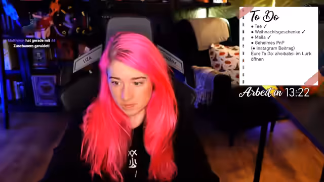 01:22:52Die Streamerin teilt ihre Herausforderungen bei der Beschaffung von Weihnachtsgeschenken und lädt die Community ein, gemeinsam Ideen zu sammeln und online zu shoppen. Sie betont, wie wichtig es ist, sich Zeit für solche Aufgaben zu nehmen, auch wenn es nur 25 Minuten sind. Neben den Weihnachtsgeschenken arbeitet sie an einem 'geheimen Pen & Paper'-Projekt, das sie als vielversprechend und spannend ankündigt. Sie erwähnt, dass ihre signierten Bücher im Cronk Shop erhältlich sind und ein gutes Weihnachtsgeschenk darstellen könnten. Die Coworking-Session wird fortgesetzt, wobei die Streamerin die Zuschauer ermutigt, ihre eigenen To-Dos zu erledigen, sei es das Aufräumen des Schreibtisches, das Vereinbaren eines Zahnarzttermins oder das Trinken von Wasser. Nach der ersten Pomodoro-Runde reflektiert sie über ihre eigene Produktivität und die der Community, wobei sie ihre Leistung mit einer 8 von 10 bewertet.