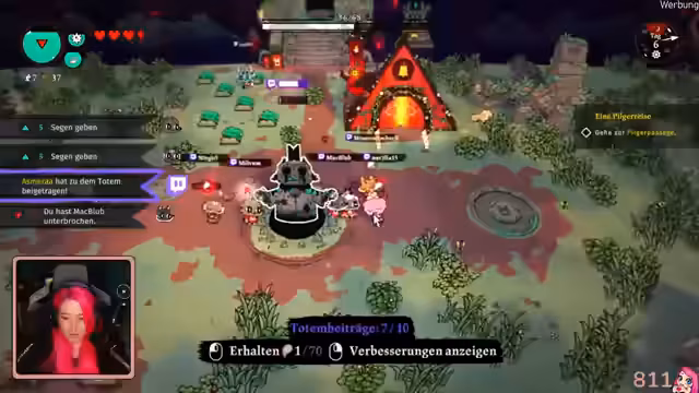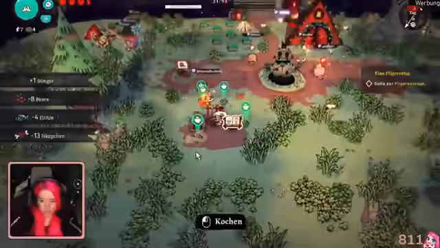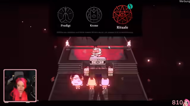 01:37:30Nach einigen technischen Startschwierigkeiten beginnt der gameplay von Castle of the Lamb. Lisa übernimmt die Rolle des Anführers eines Kults. Die Zuschauer werden aktiv in das Spiel eingebunden, indem sie über den Twitch-Chat-Aktionen auslösen können. Die erste Aufgabe besteht darin, einen neuen Anhänger zu rekrutieren und mit ihm Essen zu beschaffen.