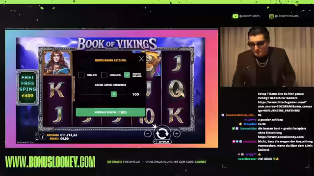 02:20:01Der Streamer beginnt mit dem Spiel Book of Vikings und steigt mit einem Einsatz von 5 Euro ein. Das Ziel ist es, den Viking-König zu landen und bei den Freispielen für Verlängerungen zu sorgen. Nachdem das Symbol knapp verfehlt wurde, wird der Einsatz auf zwei Stück erhöht. Der Streamer äußert sich enthusiastisch über das Spiel und dessen Potenzial. Gleichzeitig erwähnt er die besondere Beziehung zu seiner Frau, die er als die beste der Welt bezeichnet, und teilt mit, dass sie ein gemeinsames Blasehorn erhalten haben.