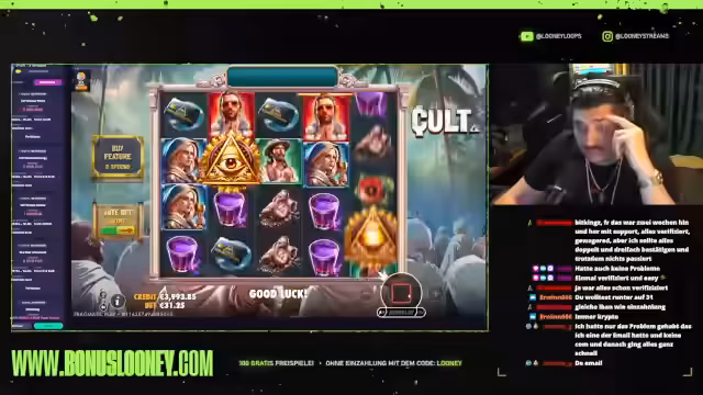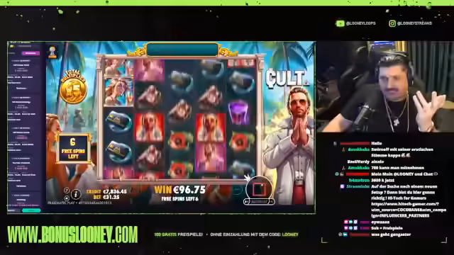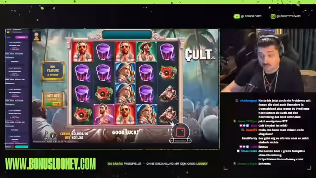 00:01:22Nach einer kurzen Unterhaltung mit dem Chat wird ein Slot des Entwicklers Pragmatic getestet, den der Streamer für gute Spiele wie 'Legacy of Loony' schätzt. Es wird ein Spiel namens 'Kultz' gespielt, bei dem der Streamer die Mechanismen wie den Multiplikator ('Multi') und die Verlängerung der Freispiele ('Verlängerung') analysiert. Die anfänglichen Runden sind ohne großen Gewinn, weshalb der Einsatz stufenweise erhöht wird.