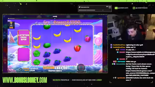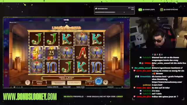 01:01:04Die Casino-Session wird mit einer weiteren Runde der 100x Freispiel-Challenge fortgesetzt. Der Streamer arbeitet eine Liste von Spielvorschlägen der Community ab. Nach mehreren gescheiterten Versuchen schafft es der Zuschauer "Fanda" mit dem Spiel "Le Bandit", die 100x zu erreichen und gewinnt somit einen weiteren 50-Euro-Bonus.