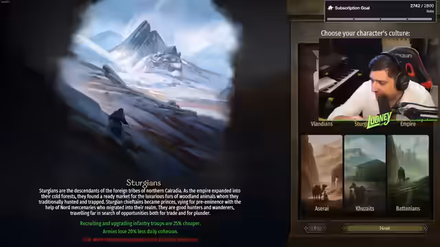 00:00:06Der Stream beginnt mit persönlichen Begrüßungen an Chat-Mitglieder. Der Streamer kündigt einen Singleplayer-Modus für Mount & Blade: Bannerlord an, wobei er erstmitten auf ein Kombinations aus Gaming und Just Chatting abzielt. Nach kurzer Diskussion mit dem Chat wird als Fraktion die Wikinger-Sturgia gewählt, um einen eigenen Häuptling zu erstellen und das Spiel damit zu beginnen.