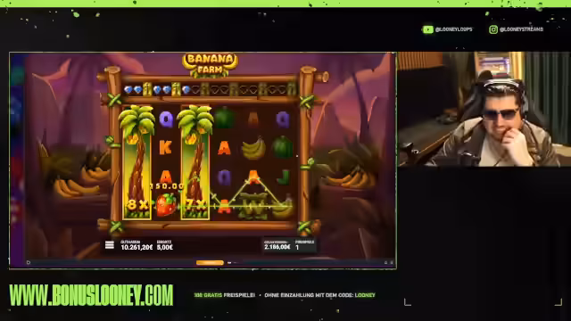 00:02:31Nach anfänglichen kleinen Gewinnen bei Dusk Princess wechselt der Streamer zu einem anderen Spiel, Banana Farm. Hier wird der Einstieg mit zwei Bonus-Käufen á 500 Euro festgelegt. Es folgt eine Phase der Spannung, in der auf ein deutliches Zeichen für hohe Gewinne gewartet wird. Die Stimmung im Chat ist aufgeladen, und der Streamer fordert das Spiel dazu auf, mit Big Wins im High-Bet-Modus zu beeindrucken, was letztendlich zu einem nennenswerten Gewinn von 2.300 Euro führt.