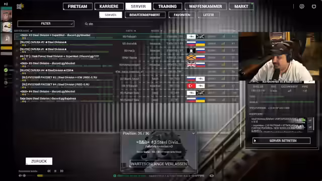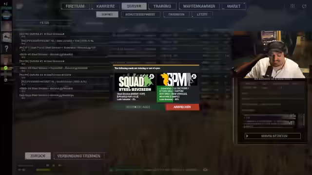 03:40:24Zu Beginn wird intensiv nach einem geeigneten Server für das Spiel Steel Division gesucht. Es gibt mehrere Server, aber der Streamer sucht einen mit einer bestimmten Mod. Nach Fehlversuchen und der Auswahl des falschen Servers wird die korrekte Mod, die Steel Division Supermod, identifiziert. Gleichzeitig wird ein Squad mit der spezifischen Konfiguration 'semi-defender' als Ziel genannt, was auf das bevorzugte, taktische Gameplay hindeutet.