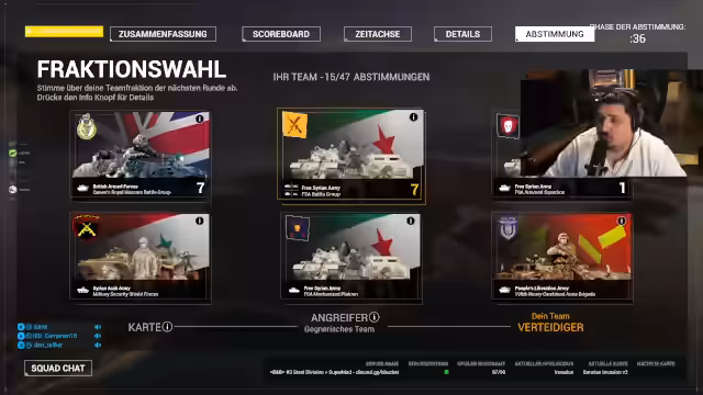 02:36:46Aufgrund von technischen Problemen und Server-Beschränkungen, die Streaming mit 15-Minuten-Verzögerung erfordern, wechselt das Stream-Team den Server. Die Kommunikation im Discord ordnet den Fraktionswechsel neu an. Ein Spieler äußert seine Frustration über das Spielverhalten anderer Mitspieler, während der Streamer versucht, die Moral aufrechtzuerhalten und die Spieler darauf hinzuweisen, dass Teamwork oberste Priorität hat.