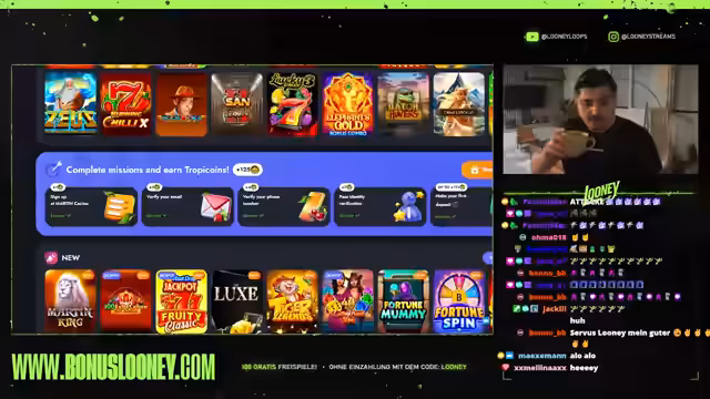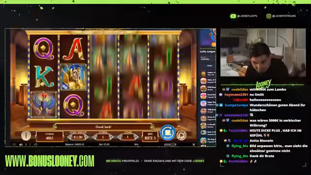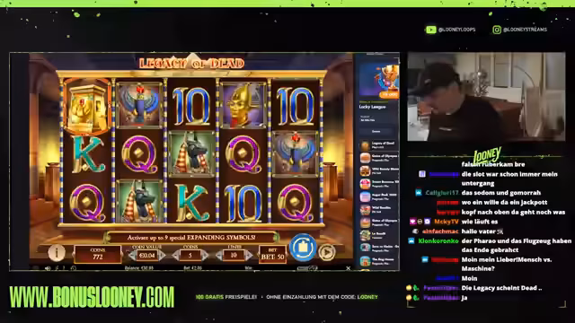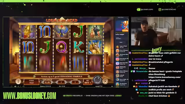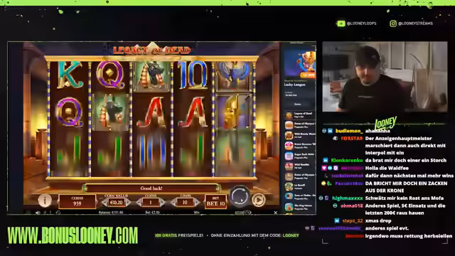 00:04:26Der Stream beginnt mit dem Streamer Looney, der seine spielsüchtige Persönlichkeit präsentiert und sein Ziel mit einem Startbudget von 5000 Euro erklärt. Der Fokus liegt darauf, 1000 Euro zu gewinnen, indem er mit kleinen Einsätzen wie 5 Euro ins Spiel "Legacy of Death" einsteigt, um das Verhalten des Automaten erst einmal zu testen. Das übergeordnete Ziel ist es, durch geschicktes Einspielen einen Profit zu erzielen und eine Linie zu finden, die zahlt.