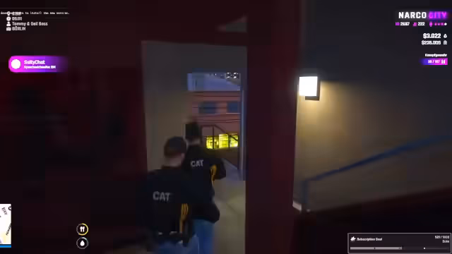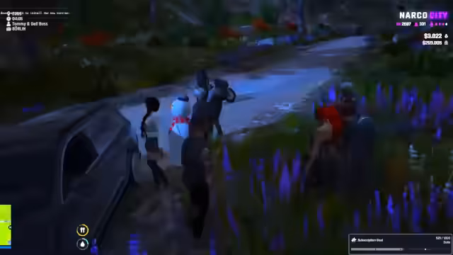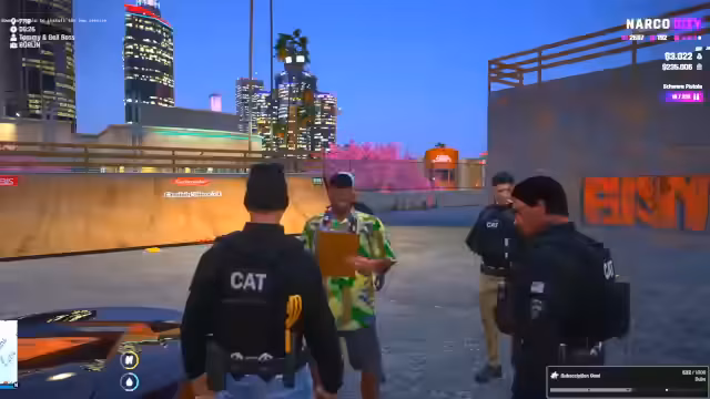 00:00:05Zu Streambeginn stellt der Streamer sicher, dass alle Anwesenden sicher sind. Er berichtet über das Auftaufen einer neuen Person namens Adriana, die anscheinend vom Dach gefallen ist. Ein wilder Dialog entfacht, in dem der Streamer seine Gang als Favela bezeichnet und über seltsame Regeln wie mögliche Gemeinschaftsduschen spricht. Kurz darauf bricht er den Kontakt zu einer Person namens Merrick ab und gibt an, dieser sei tot. Ein anderer Streamer, der nicht genannt wird, beginnt daraufhin, zu flirten und erhält Lob für seine Verführungskünste.