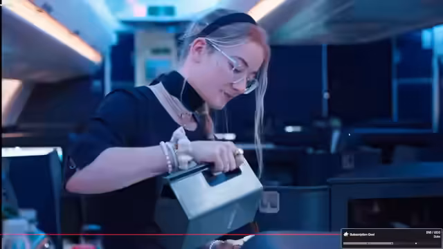 00:59:21Nach der Pause beginnt der Frühstücksservice. Die Lichter im Flugzeug werden gedimmt, um einen Sonnenaufgang zu simulieren und die Passagiere zu wecken. Der Streamer zeigt die Vorbereitung des Essens und spricht über die Vielfalt des Berufs, der von jungen bis sehr erfahrenen Flugbegleitern ausgeübt wird. Während des Services werden auch ungewöhnliche Nebentätigkeiten der Besatzung angesprochen, wie nebenbei Bestatter oder Tatortreiniger zu sein.