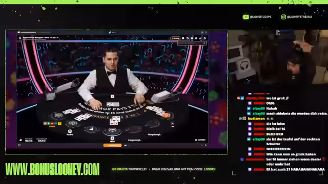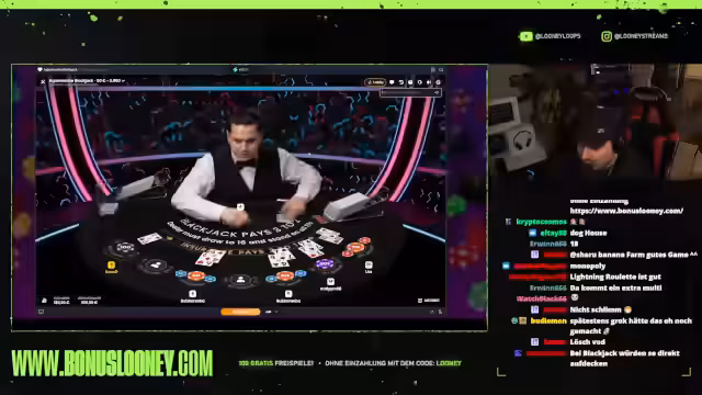 01:57:06Nachdem 'Banana Farm' keinen positiven Verlauf mehr genommen hat, entscheidet der Streamer, das Spiel zu wechseln. Er stellt verschiedene Casino-Spiele wie Roulette, Blackjack und Baccarat vor, wobei Blackjack seine Aufmerksamkeit erregt. Er beginnt damit, an einem Blackjack-Tisch zu spielen und interagiert intensiv mit dem Dealer und den anderen Spielern am Tisch.