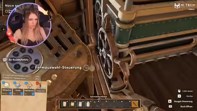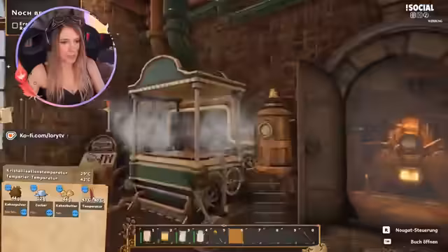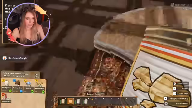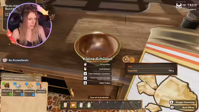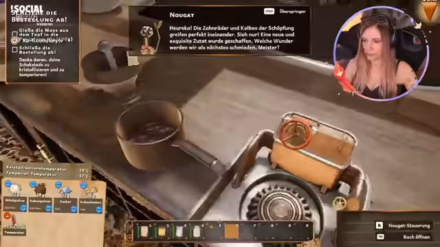 03:42:12Lory stellt ihre erste Schokolade nach Tutorial-Rezept her: 45g Kakao, 20g Zucker, 45g Kakaobutter. Sie lernt das Tempering-Verfahren (29°C abkühlen, auf 37°C erhitzen), um die Schokolade stabil zu machen. Dabei gibt es Herausforderungen: Sie verschüttet Materialien, muss den Ofen mit Kohle befeuern und den Druck regulieren. Das Spiel wird als detailliert und anspruchsvoll beschrieben.