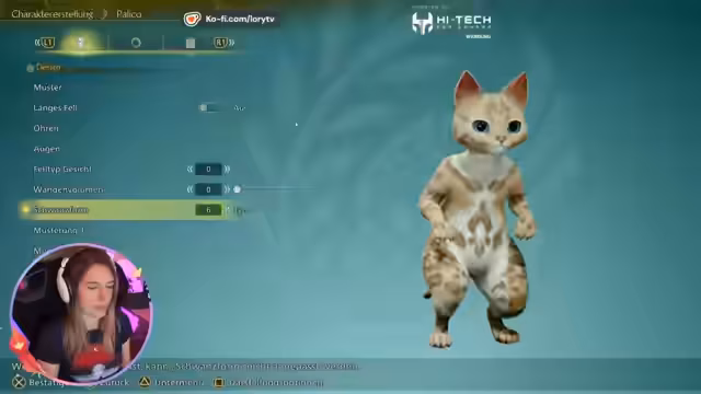 01:54:04Nach Abschluss des Downloads beginnt die Streamerin mit dem Spielstart von Monster Hunter Rise. Das Spiel fordert zunächst die Eingabe persönlicher Daten und die Konfiguration verschiedener Einstellungen, wie Auflösung, Helligkeit und Audiowiedergabe. Der Hauptfokus liegt auf der detaillierten Erstellung des eigenen Charakters, bei der die Streamerin lange diskutiert, welche Frisur, Augenfarbe und Gesichtsmerkmale die richtige sind und die Community per Abstimmung an der Entscheidung beteiligt.