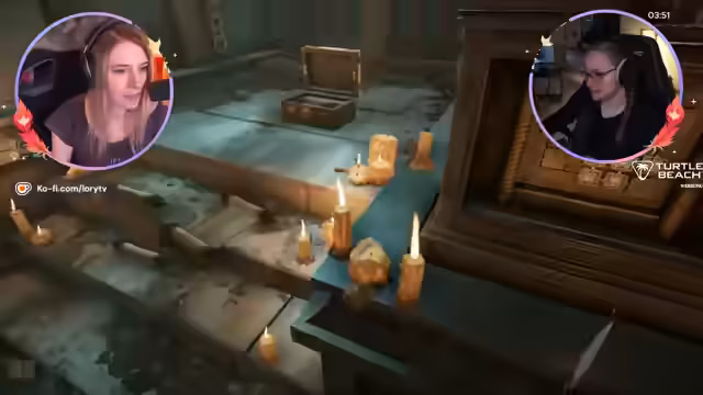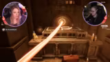 01:36:45Ein komplexes Rätsel erfordert die kooperative Anwesenheit beider Streamer. Indem sie sich gemeinsam auf bestimmte Füße stellen und einen Feuerstrahl beobachten, der eine Tür öffnet, finden sie einen Schlüssel. Anschließend müssen sie Flammen in Kerzenleuchter setzen, indem sie diese rüberschieben. Mit dem so erhaltenen Schlüssel gelingt es ihnen, eine Tür zu öffnen, doch knapp bevor sie entkommen, läuft ihnen die Zeit davon. Sie nehmen sich aber Zeit für eine Pause und bewerten den Dracula-Raum als gelungen, bevor sie das Raumschiff-Rätsel in Angriff nehmen.
