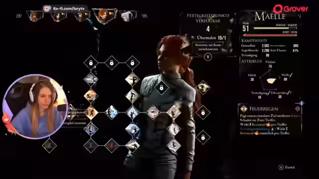 02:55:43Ein Hauptfokus liegt auf der Optimierung des Spiel-Teams. Die Streamerin verteilt Attribute wie Stärke, Glück und Verteidigung, um die Kampfperformance zu maximieren. Sie analysiert und wählt neue Fähigkeiten wie Lichtschall und Glitztanz, die strategische Vorteile bieten, und passt ihre Ausrüstung an, um spezifische Elementarschaden und Effekte wie Konter oder Stapelbare Boni zu nutzen, um den Kampf gegen mächtige Gegner zu meistern.