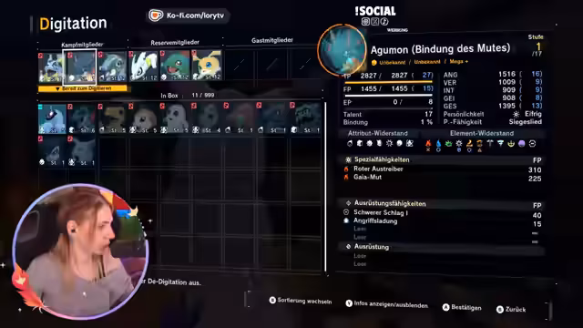01:19:34Der Stream beginnt mit dem Gameplay eines Digimon-Spiels, wobei die Streamerin ihren Team-Zusammensetzung und die Kämpfe diskutiert. Sie erkundet verschiedene Digimon, ihre Stärken und Schwächen, und entscheidet sich für eine Auswahl, die Elemente wie Feuer, Luft und Heilung abdeckt. Es werden Fragen zur Entwicklung der Digimon, zum Leveln und zur Verbesserung der Werte gestellt und im Chat diskutiert. Die Streamerin experimentiert mit der Kombination von Fähigkeiten und analysiert die Kampfsysteme des Spiels im Detail.