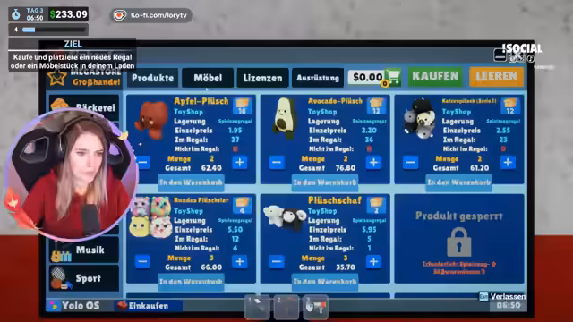 01:31:03Der Streamer startet das Spiel 'Megastore Simulator'. Nach einer Phase der Namensgebung für den virtuellen Laden, der letztendlich 'Losties Megastore' heißt, beginnt das Gameplay. Die Aufgaben umfassen das Platzieren von Produkten in Regalen, Festlegen von Preisen und das Bedienen von Kunden an der Kasse. Es werden spezifische Produkte wie Avocado- und Katzen-Plüschtiere verkauft. Der Streamer experimentiert mit Preiserhöhungen und beschwert sich über den Zeitdruck und das stressige Management des Ladens.